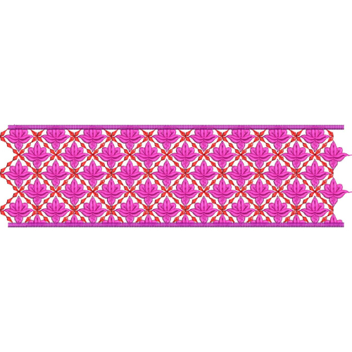 The overall composition highlights symmetry, repetition, and bold floral styling, resulting in a rich lace embroidery border. The combination of lotus-inspired motifs and interconnected structure makes this design suitable for decorative garment applications where a strong and continuous lace pattern is desired.