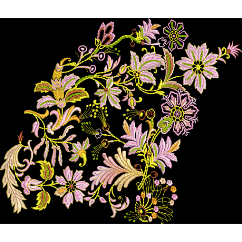 Artistic Curved Floral Embroidery Motif Textile Design on Black