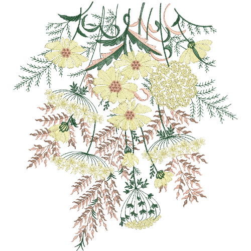 The lower portion features extended hanging motifs that taper gently, completing the design with a delicate and artistic finish. Fine stitch-like detailing highlights craftsmanship and precision, making this design ideal for embroidery applications that emphasize natural beauty, softness, and intricate botanical artistry.