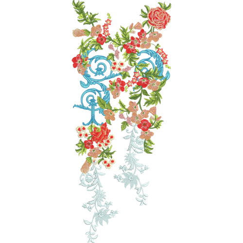 This embroidery design features a creative and expressive neckline composition that blends ornamental scrollwork with a vibrant floral arrangement. The layout follows an asymmetrical flow, giving the design a natural and artistic movement.