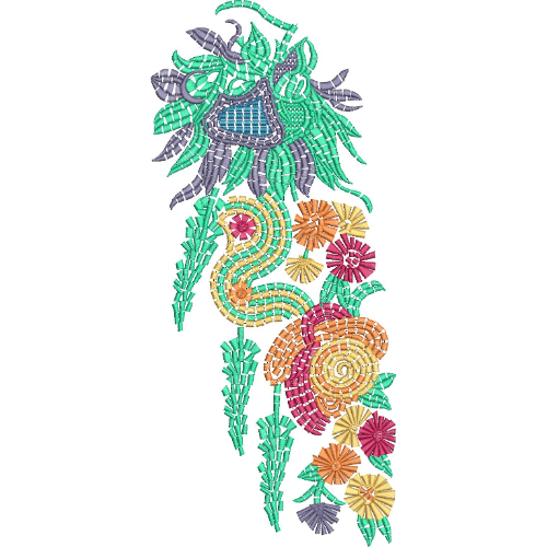 This artistic neckline embroidery design features a unique mosaic-inspired composition combining abstract leaves, spiral florals, and modern decorative elements. Designed in a stylish asymmetrical layout, the embroidery flows gracefully from the shoulder area downward, forming an elongated neckline pattern with a contemporary and creative appeal.