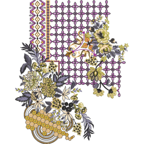 This unique neckline embroidery design features a striking asymmetrical composition that blends intricate floral artistry with bold geometric structure. One side of the design is enhanced with a detailed lattice-style net pattern in a rich purple tone, creating a strong visual base that adds texture and modern appeal. Along the edge, a decorative border with geometric and zigzag elements introduces contrast and defines the structure of the neckline.