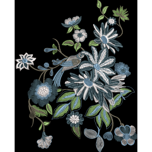 This illustration showcases a beautifully composed floral embroidery motif set against a deep black background. The design features layered flowers in soothing shades of blue, white, and soft grey, complemented by finely detailed green leaves and slender stems. Each blossom is intricately stitched with textured petals and shaded centers, giving the motif a realistic and handcrafted embroidery appearance.