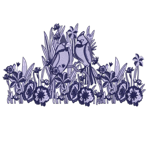 A charming embroidery-style textile print featuring two blue birds surrounded by detailed floral and foliage elements arranged as a decorative garden border on a light background.
