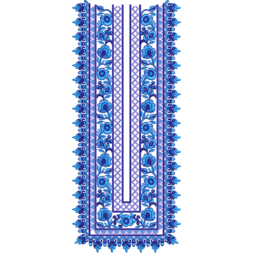 A classic blue floral neckline embroidery design featuring a long vertical panel with decorative borders, ideal for traditional and ethnic garments.