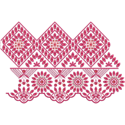 With balanced spacing, sharp geometric framing, and professional-quality stitch control, this lace embroidery border design is ideal for dupatta trims, saree borders, sleeve hems, kameez panels, bridal garments, festive wear, and formal attire where bold geometric and floral lace detailing is desired.