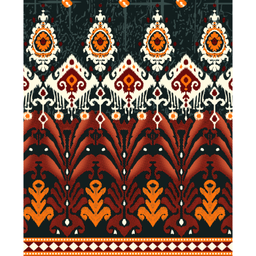 A striking traditional border textile design inspired by ikat and folk motifs. The dramatic rust orange, black, ivory, and deep red color palette makes this print ideal for statement ethnic apparel and decorative fabrics.