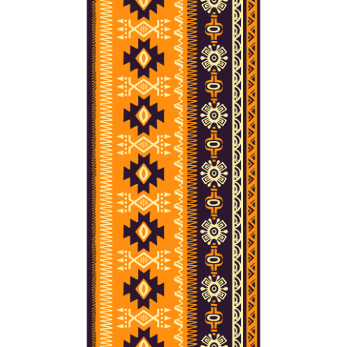 A striking tribal-inspired border textile design featuring repeated geometric motifs and patterned bands. The bold mustard yellow base with black, white, and orange accents makes this print ideal for ethnic apparel and statement decorative fabrics.