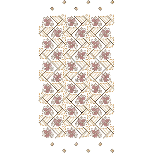 Within each chevron compartment, ornamental floral motifs are carefully positioned to maintain symmetry and alignment. The blossoms are embroidered with layered satin stitches that provide gentle dimension and refined texture. Petal details are enhanced through controlled directional stitching, while compact internal fills add depth and visual clarity. Small dotted stitch accents and linear detailing complement the lattice structure, reinforcing the geometric rhythm.