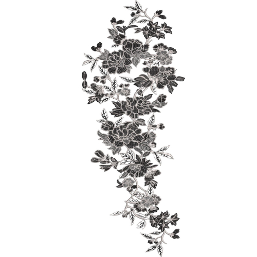 The monochrome palette emphasizes contrast, structure, and craftsmanship, allowing the floral forms and delicate leaves to stand out clearly against the white background. The varying sizes of blossoms and intertwining stems add depth and movement while maintaining visual balance and elegance.