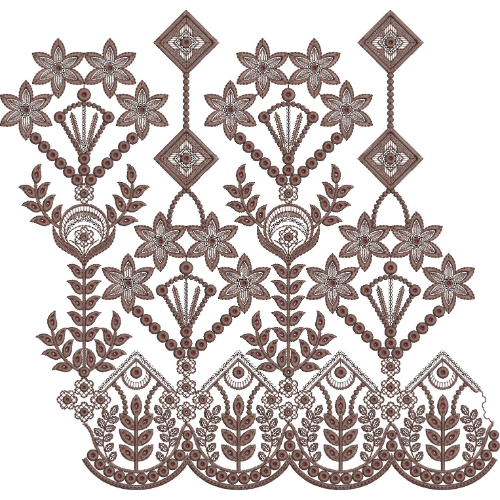 With precise alignment, smooth transitions between curved and angular elements, and professional-quality digitizing, this lace embroidery border design is ideal for dupatta trims, saree borders, sleeve hems, kameez panels, bridal garments, festive wear, and formal attire where intricate floral and geometric lace detailing is desired.
