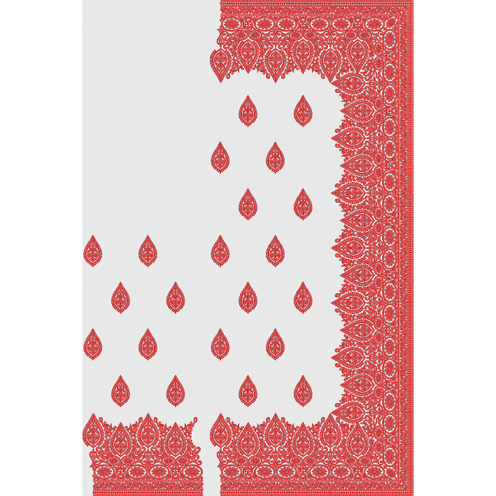 The border is the most dominant feature, crafted with dense and elaborate patterns that include layered paisley shapes, floral elements, and decorative bands. The vertical border is particularly rich, featuring closely arranged paisley forms that create a textured and luxurious edge. The top and bottom borders complement this with equally detailed patterns, ensuring a cohesive and well-structured finish.