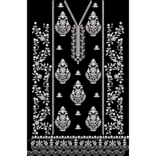 The black background provides strong contrast, allowing the white embroidery-style artwork to stand out clearly and enhancing its refined and sophisticated appeal. This front panel design is ideal for use on kurtis, long shirts, anarkali dresses, formal wear, festive outfits, and bridal-inspired ethnic garments. It is also suitable for digital textile printing, embroidery reference designs, surface pattern projects, and premium fashion fabric collections.