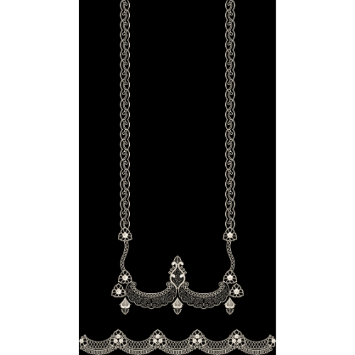An elegant neckline panel textile design featuring delicate chain-style side borders, ornamental floral connectors, and a refined lower lace border in white on a black background, ideal for timeless and graceful garments.