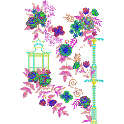 This colorful artistic floral neckline embroidery design features a vibrant and creative composition inspired by nature and ornamental scenery. The design showcases a stylish front neckline layout enhanced with blooming multicolor floral motifs, delicate leaves, decorative lantern and pillar elements, and ornamental hanging details. The fusion of scenic decorative elements with rich floral embroidery creates a unique and premium designer look perfect for women’s kurtis, kameez, tunics, and fashionable dresses.