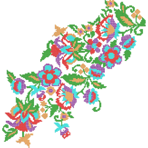 Bright multicolor flowers in shades of red, turquoise, purple, pink, and orange are intricately arranged among fresh green leaves and decorative stems. The pixelated cross-stitch effect adds depth and detail to each motif, creating a rich and lively embroidered surface. The balanced placement of floral clusters and trailing vines enhances the visual harmony, making the design both traditional and visually striking.