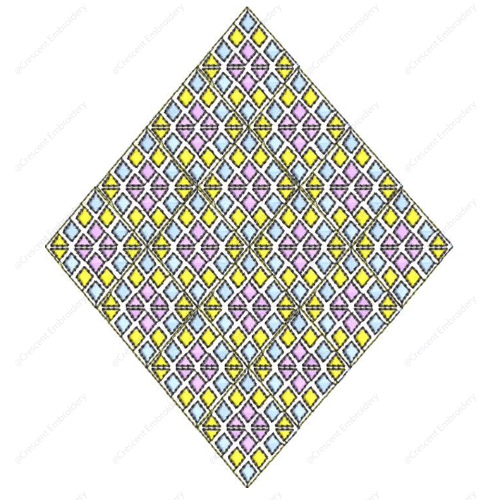 This visually engaging embroidery design features a diamond-shaped layout composed entirely of a repeating geometric lattice pattern. The design is built from small interconnected diamond and cross-like shapes, forming a tightly structured grid that creates a sense of precision and uniformity.