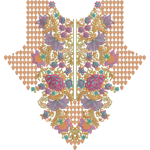 This colorful floral neckline embroidery design features a rich and heavy ornamental composition created for women’s ethnic and festive wear. The design highlights beautifully arranged large blooming flowers, detailed leaves, and elegant paisley elements combined with a geometric lattice background that enhances the overall luxury look. The symmetrical neckline layout with a center slit opening makes it perfect for kurtis, kameez, frocks, and traditional dresses.