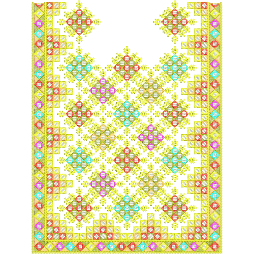 This colorful geometric neckline embroidery design features a vibrant and traditional gala embroidery pattern with a beautifully structured symmetrical layout. The design is created to enhance the neckline and front panel of kurtis, suits, tunics, and ethnic wear, giving garments a bright and festive appearance.