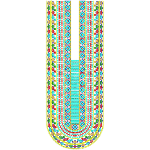 This vibrant neckline embroidery design features a bold combination of colorful geometric patterns and traditional ethnic-inspired borders, creating a striking and modern panel-style neckline composition. The design is structured in a long U-shaped layout that forms a complete front panel, making it ideal for statement necklines and shirt front embroidery.