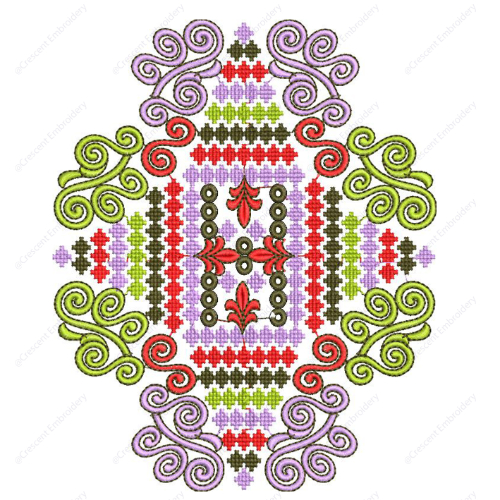 The stitching is precise and well-defined, combining cross-stitch textures with smooth satin techniques to clearly distinguish between geometric and ornamental components. This embroidery design is ideal for decorative cushion applications, offering a unique fusion of structured patterns and elegant scrollwork with a vibrant, eye-catching appeal.