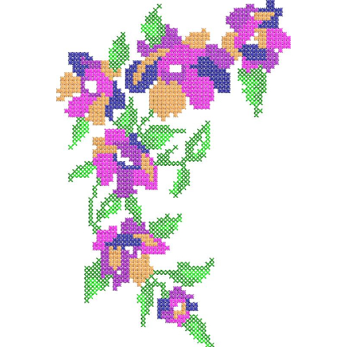 This charming neckline embroidery design features a classic cross-stitch inspired floral composition arranged in a graceful asymmetrical layout. Designed with a pixel-style embroidery texture, the pattern showcases beautifully formed flowers and leafy vines created through detailed cross-stitch elements, giving it a handcrafted and traditional needlework appearance.