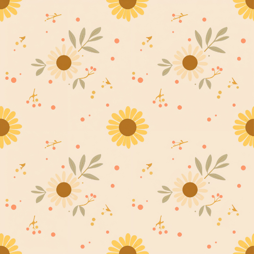 The floral elements are spaced evenly across the composition, allowing the daisies and botanical accents to create a harmonious repeating layout. The simplified shapes and warm color palette give the design a friendly and modern decorative appearance. The combination of bright yellow flowers with soft botanical details creates a fresh and cheerful floral pattern.