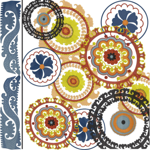 This vibrant embroidery design features a dynamic arrangement of overlapping circular medallions, each filled with intricate floral and ornamental detailing. The composition showcases multiple round elements in varying sizes, layered together to create depth and visual movement across the design.
