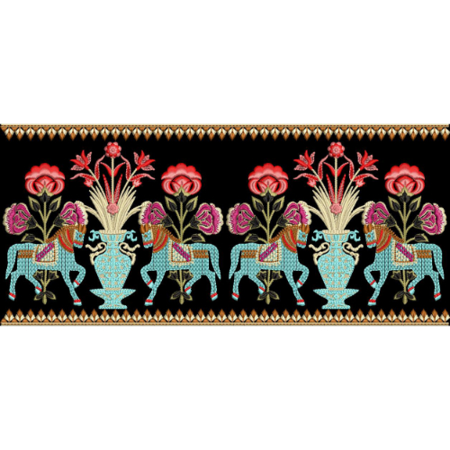 A traditional embroidered border featuring stylized elephants, floral vases, and ornamental detailing, ideal for rich ethnic textile applications.