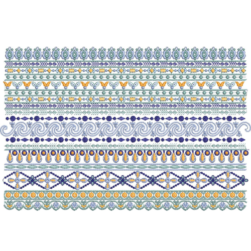 The stitch execution throughout the collection demonstrates consistent density, precise alignment, and balanced spacing between motifs. Each border can function independently or be combined to create layered decorative effects.