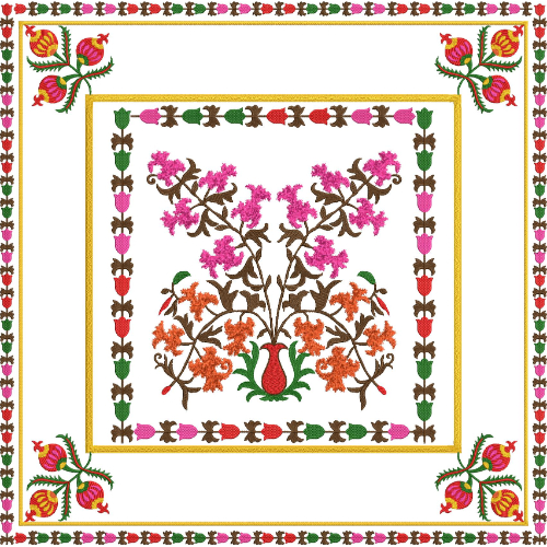 With its combination of central floral artistry, structured borders, and vivid color palette, this embroidery design is ideal for decorative garment embellishments and artistic fabric applications, offering a traditional yet visually striking aesthetic.