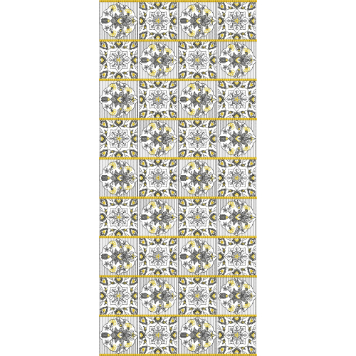 The color palette combines neutral greys and whites with subtle yellow highlights, adding warmth and contrast without overpowering the design. Fine linework and precise detailing give the artwork a clean, illustration-based appearance reminiscent of engraved or hand-drawn tile patterns. Vertical pinstripe-style separators enhance the structured layout and add rhythm to the overall design.
