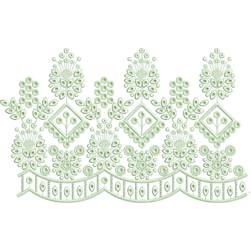 This graceful lace embroidery border design features a harmonious blend of stylized floral motifs, diamond-shaped accents, and a softly scalloped base. The composition reflects refined symmetry and fine ornamental detailing, making it suitable for elegant lace embroidery applications.