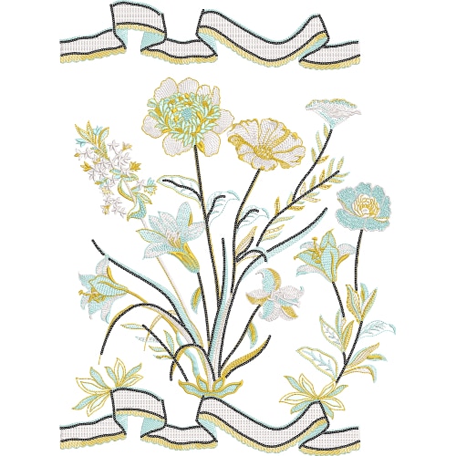 This elegant lace embroidery design features a soft and graceful floral arrangement enhanced with flowing ribbon elements, creating a refined and artistic composition. The central focus consists of multiple stylized flowers, each digitized with fine satin outlines and light fill stitches. The petals are delicately shaded using pastel tones such as soft yellow, ivory, and light turquoise, giving the flowers a subtle dimensional effect while maintaining a clean and airy appearance.