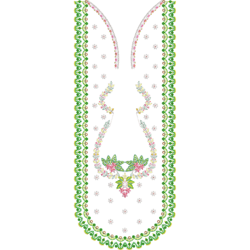 This neckline embroidery design features a soft and graceful composition defined by a long elongated panel with a beautifully detailed scalloped border. The neckline is shaped with a gentle curve at the top, flowing into a vertically extended form that enhances the elegance and length of the design. The outer edges are decorated with a continuous scalloped pattern, enriched with fine bead-like detailing that creates a lace-inspired decorative frame.