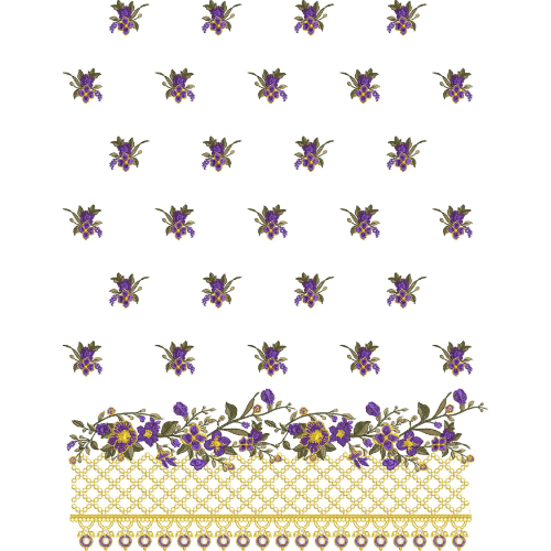 A graceful floral sprig pattern featuring small purple flower motifs with a decorative gold-accented border on a light background, ideal for elegant textile prints and refined fashion fabrics.