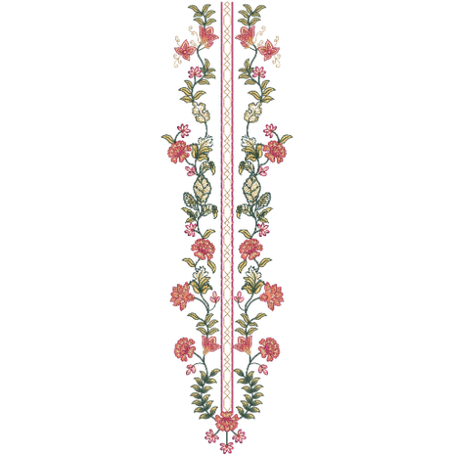 This neckline embroidery design features a soft and elegant composition centered around two symmetrical vertical floral vines. The design is structured with a narrow central strip, enhanced by fine linear detailing that acts as a subtle divider, maintaining balance and alignment throughout the layout. On both sides, beautifully arranged floral vines extend vertically, showcasing blooming flowers, buds, and finely shaped leaves.
