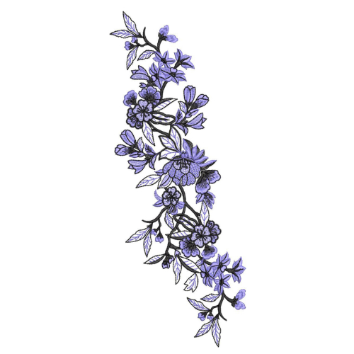 A delicate floral textile illustration featuring lavender-blue blossoms and fine black stems, arranged in a graceful flowing vine composition.