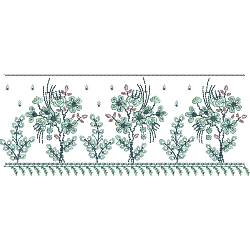 This elegant lace embroidery design features a continuous horizontal border composed of finely detailed floral clusters arranged in a balanced and repeating sequence. Each motif showcases a combination of small and medium-sized blossoms with rounded petals, surrounded by slender leafy stems and decorative branches that enhance the organic flow of the design.