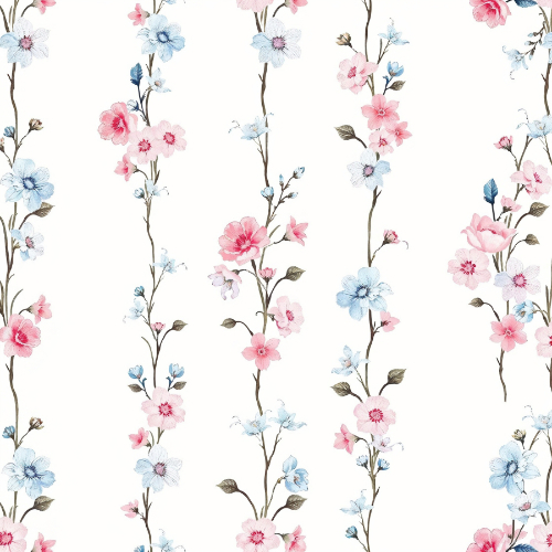 This seamless floral pattern features slender botanical branches decorated with soft pink and pastel blue blossoms, arranged in a refined vertical composition. The delicate flowers display gently rounded petals with subtle shading that gives them a light watercolor-inspired appearance. The soft pink blossoms create warmth and elegance, while the pastel blue flowers introduce a fresh and calming contrast within the design.