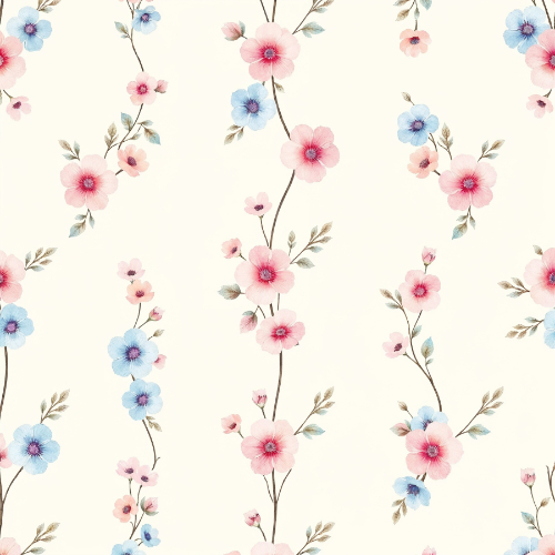 This elegant seamless pattern features graceful botanical stems decorated with delicate blossoms in soft pink and powder blue tones. The flowers are illustrated in a refined watercolor style with gently layered petals and softly detailed centers that create a natural hand-painted botanical appearance.