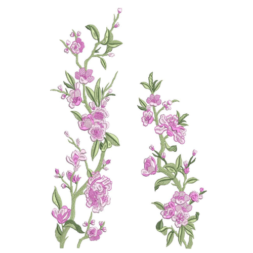 Fresh green leaves and slender stems weave naturally through the florals, enhancing the organic flow and balanced structure of each motif. The vertical orientation of the vines makes the design ideal for garment panels, borders, and decorative placements.