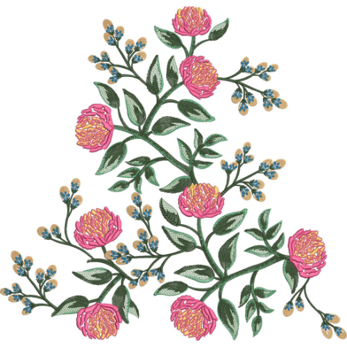 This beautiful embroidery-style design showcases a refined floral vine composition arranged in a balanced triangular flow. The motif features delicate pink flowers with layered petals and warm yellow centers, giving the blossoms a soft yet vibrant appearance. Each flower is carefully detailed with fine stitch textures that replicate the look of hand embroidery.