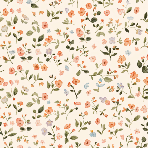 The color palette blends soft coral blossoms, gentle pastel flowers, and muted green foliage, producing a charming cottage-style botanical aesthetic inspired by wildflower fields.