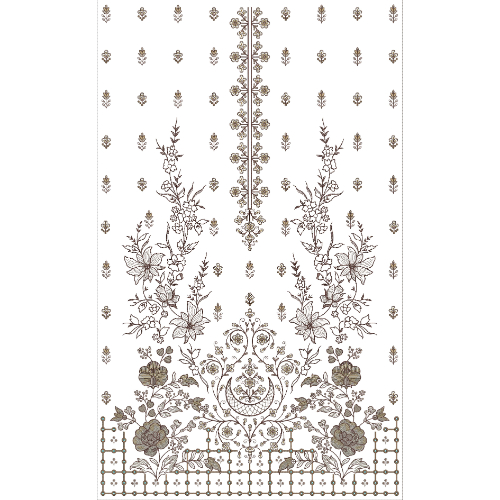 A geometric grid-like border at the hemline introduces structure and contrast, completing the design with a polished and cohesive finish. The use of soft beige tones enhances the timeless and sophisticated appeal, making this embroidery design ideal for formal wear, festive attire, and premium ethnic fashion collections.