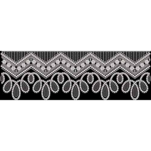 The monochrome black-and-white color scheme enhances contrast and highlights the fine stitch-like detailing throughout the design. Scalloped edges, oval motifs, and ornamental loops are arranged rhythmically, creating a graceful and timeless lace effect. The upper section features a zigzag ornamental band, while the lower portion showcases flowing looped patterns that add softness and movement.