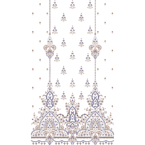 This embroidery dress design showcases a sophisticated and artistic composition featuring delicate hanging ornamental motifs that create a graceful vertical flow. The upper section is adorned with fine suspended elements connected through slender linear patterns, adding a unique and elegant structure to the design.