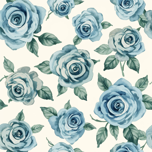 This seamless floral pattern features a sophisticated arrangement of large blooming blue roses illustrated in a classic botanical style. The roses display layered petals with soft shading and delicate detailing, giving the flowers a refined and elegant appearance. The cool blue tones of the blossoms create a calm and graceful aesthetic that enhances the overall floral composition.