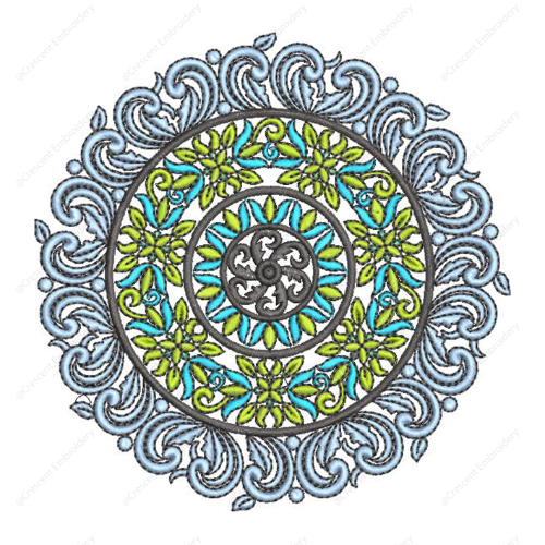 The color palette blends soft blue tones in the outer scrollwork with vibrant green accents in the floral ring and subtle gray tones in the center. This combination creates a pleasing contrast and highlights the intricate detailing.
