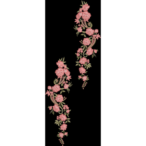 A graceful embroidered rose vine motif featuring cascading floral elements and delicate leaves, ideal for vertical textile placements and luxury fabric designs.